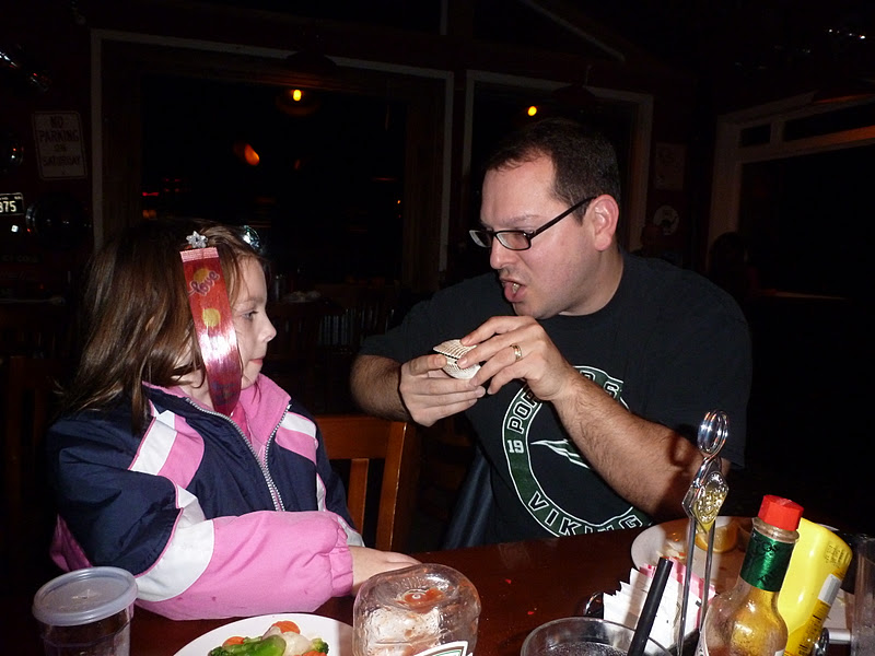 Despite having lunch at 4, we were hungry enough to have a Roadhouse 101 dinner at 7. Luis entertains Siena with the cool shell Siena and I found at Bayocean.